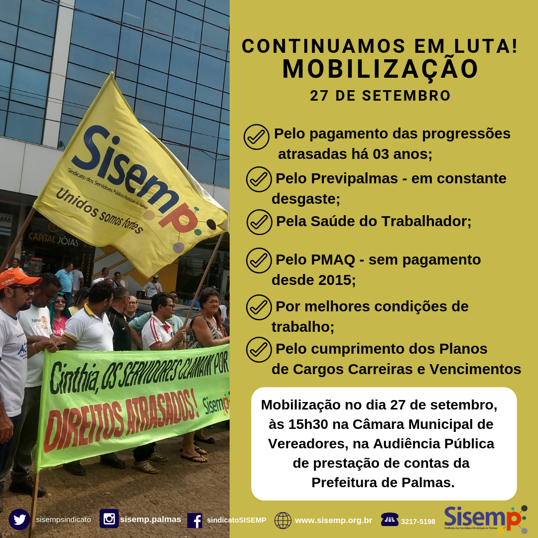 A luta dos servidores públicos da Prefeitura Municipal de Palmas, pelo pagamento dos direitos pendentes ainda não acabou. O Sindicato dos Servidores Públicos Municipais de Palmas (Sisemp) dará continuidade a agenda de mobilizações públicas na quinta-feira, 27, às 15h, na sessão de prestação de contas da Prefeitura de Palmas na Câmara Municipal.